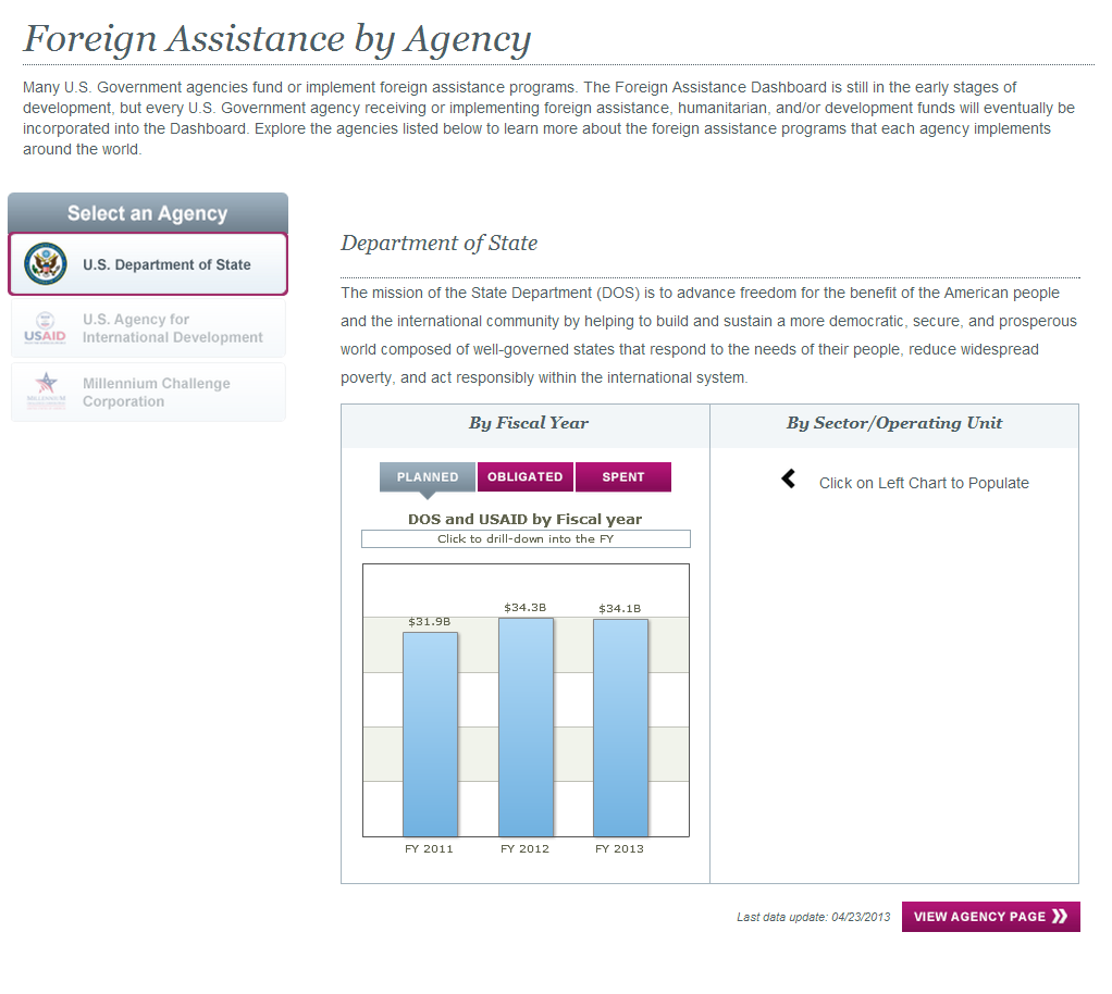 Launched in December 2010, the Foreign Assistance Dashboard is intended to serve as the clearinghouse for all US foreign assistance data. State Department’s F Bureau is in charge of coordinating, collecting, coding, and visualizing data from all 22+ agencies that disburse aid—no small feat. And while the project is still a work in progress, kudos to State for continuing to upgrade the site.