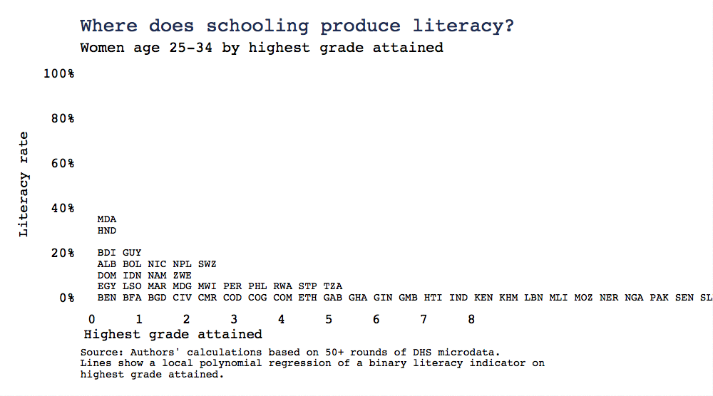 Even in a blog post, some methodological health warnings are also in order. In some countries, the number of adult women with just, say, one year of schooling is a tiny fraction of the population. To address this, we smooth the data in the figure above using a simple local polynomial regression of literacy on years of schooling, separately for each of the 53 countries in the sample, which helps overcome the noisiness of estimates based on small samples.