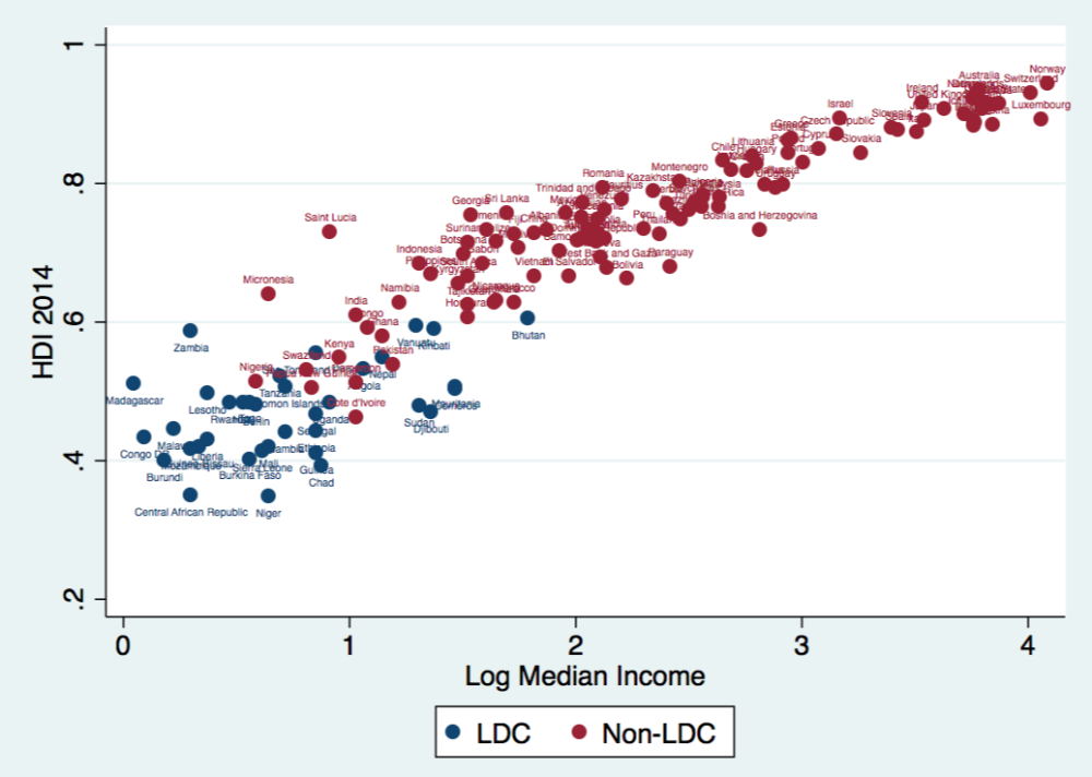 The median income and the Human Development Index suggest that LDCs are indeed *amongst* the poorest countries, but there is certainly overlap with other countries, and no particular “kink” at the “graduation” point. Whilst four countries have “graduated” from LDC status, they don’t seem to have really moved to a substantially higher level of average incomes or human development.