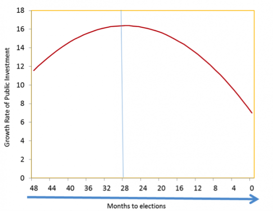 As elections approach, governments expand spending programs or reduce taxes to improve their chances of getting reelected. This is reflected in higher budget deficits (that is, expenditures exceed revenues by more than they would otherwise). The growth rate of public investment is also affected by the electoral cycle; it is larger at the beginning of the mandate, peaking at about 28 months before elections (see Figure 1).