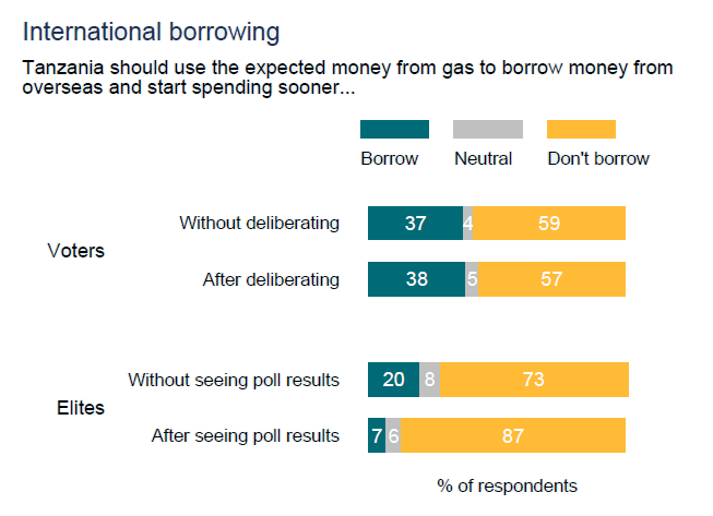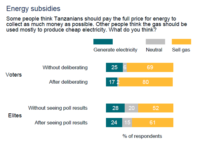 Even the most ardent defenders of democracy sometimes worry that populist pressure may lead to short-sighted (or populist) economic policy choices — especially in a low-income country in the midst of a resource boom. Tanzania is a good case study: It's poor, had an imperfect but somewhat competitive election last year, and recently discovered large reserves of natural gas. So after polling 2,000 ordinary Tanzanians in 2015 about their views on the use of expected natural gas revenue with our colleagues Nancy Birdsall, Jim Fishkin, Abel Kinyondo, and Mujobu Moyo, we decided to follow up with an experiment polling Tanzanian “elites,” to see whether they are aligned with citizens, or could be swayed by citizens’ views.