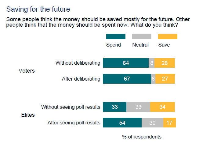 The results suggest a more complicated narrative than short-sighted voters versus prudent elites. Voters are more eager than elites to spend money now rather than save for the future (more favorable spending on services like health and education, not long-term capital investments). But it is elites that are also more tempted by proposals to use gas for fuel subsidies or relatively high-cost domestic energy projects over selling gas at global prices. And elites are more skeptical than voters of transparency and international oversight of gas revenues. On those topics, not only is the public arguably more prudent than elites, but (at least in our slightly artificial experimental setting) it appears (figures below) public opinion can actually sway elites in a more cautious, economically orthodox direction.