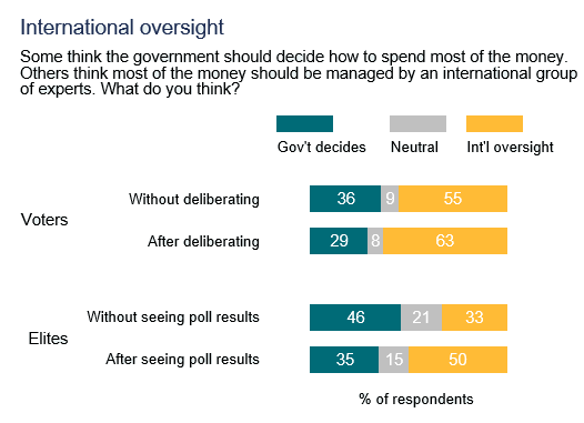 Voters initially showed much stronger support for some form international oversight to manage revenues, while elites were much less skeptical of government management at baseline. Researchers often cite greater transparency as a bedrock combatant of the resource curse, assuming that more transparency – whether in the form of external budgetary review or publishing contracts (which voters and elites both supported quite adamantly) – will lead to stronger accountability between the public and policymakers. This will, in turn, likely decrease the risk of corruption and mismanagement. Groups, such as EITI and NRGI, have made this their calling card mission as a first step in responsible resource management.