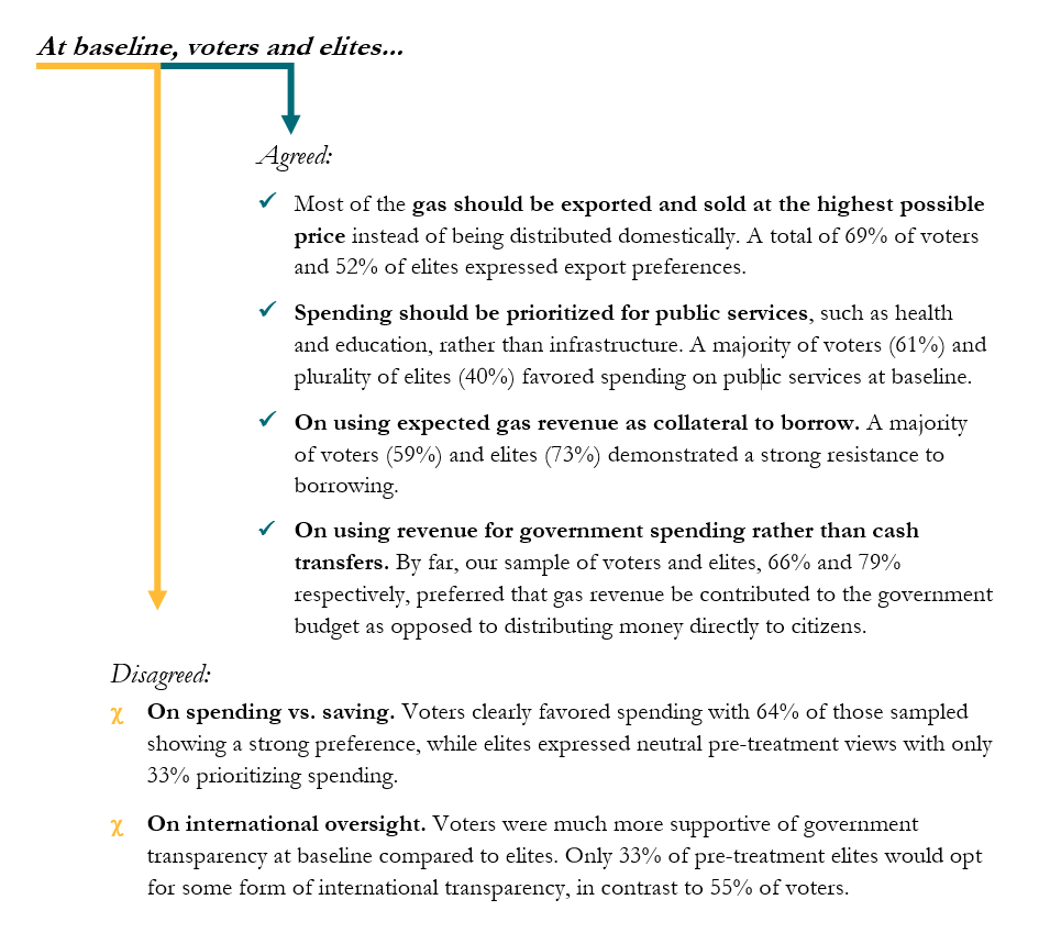 Voters were narrowly opposed to using natural gas as collateral. In contrast, elites expressed a fairly strong preference not to use the gas as collateral, and when shown voters’ poll results, this opposition strengthened. Based on anecdotal conversations with the “elite” sample, we suspect opposition to borrowing is strongly related to Ghana's recent experience of converting an oil boom into a debt fiasco. In anticipation of a large windfall of oil revenue, the Ghanaian government decided to borrow heavily using the prospective revenue as collateral. As global oil prices plummeted, Ghana’s impending boom went bust, urging caution to policymakers in other newly resource-rich countries.