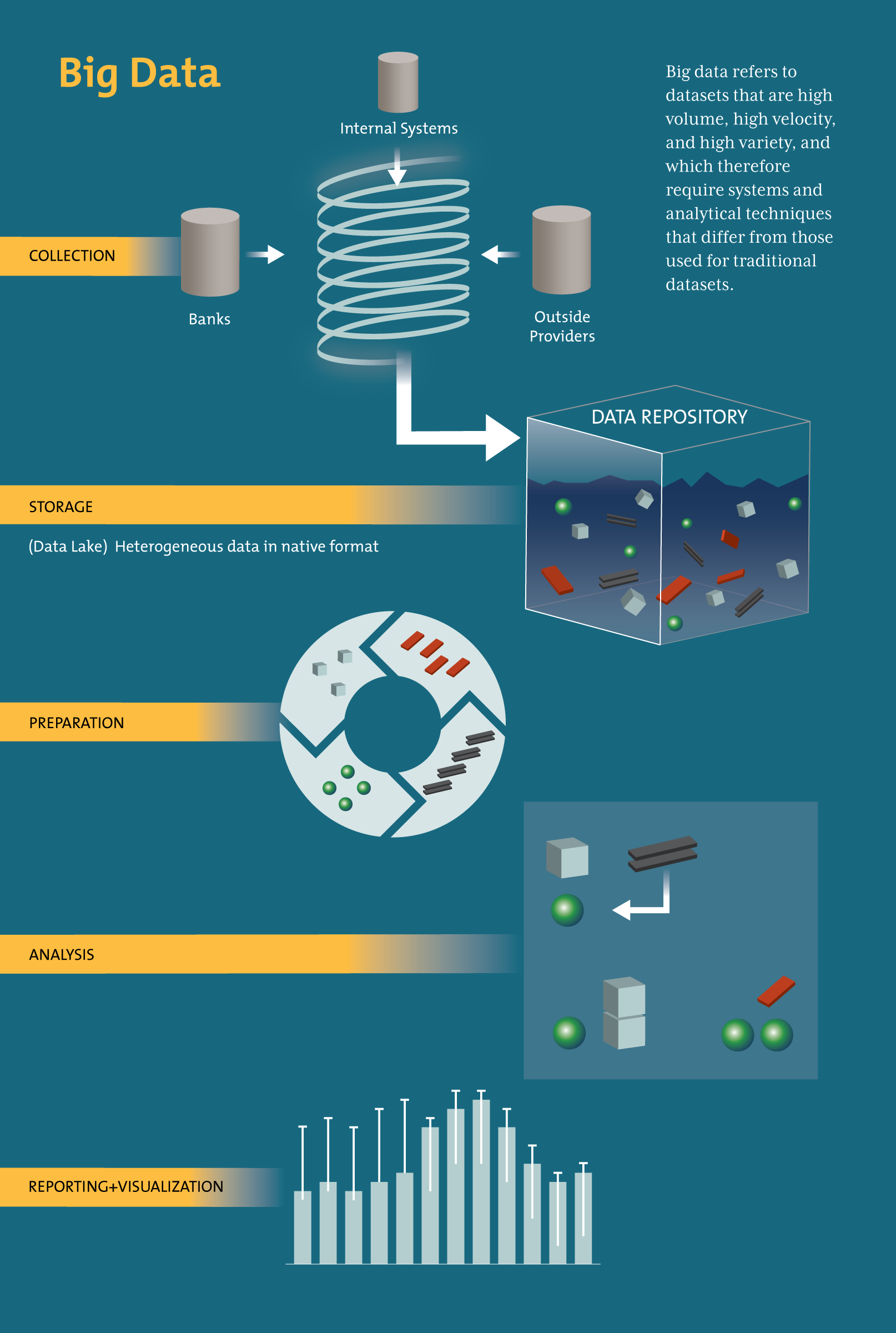 Big data – refers to datasets that are high in volume, velocity, and variety, and therefore require systems and analytical techniques that differ from those used for traditional datasets. Compared with relational databases, big data applications offer more scalable storage capacity and processing. They also allow many different types of data to be stored in one place, so compliance staff spend less time gathering information from disparate sources. Most important, they can greatly expand the range and scope of information available for Know Your Customer (KYC) and suspicious transaction investigations.