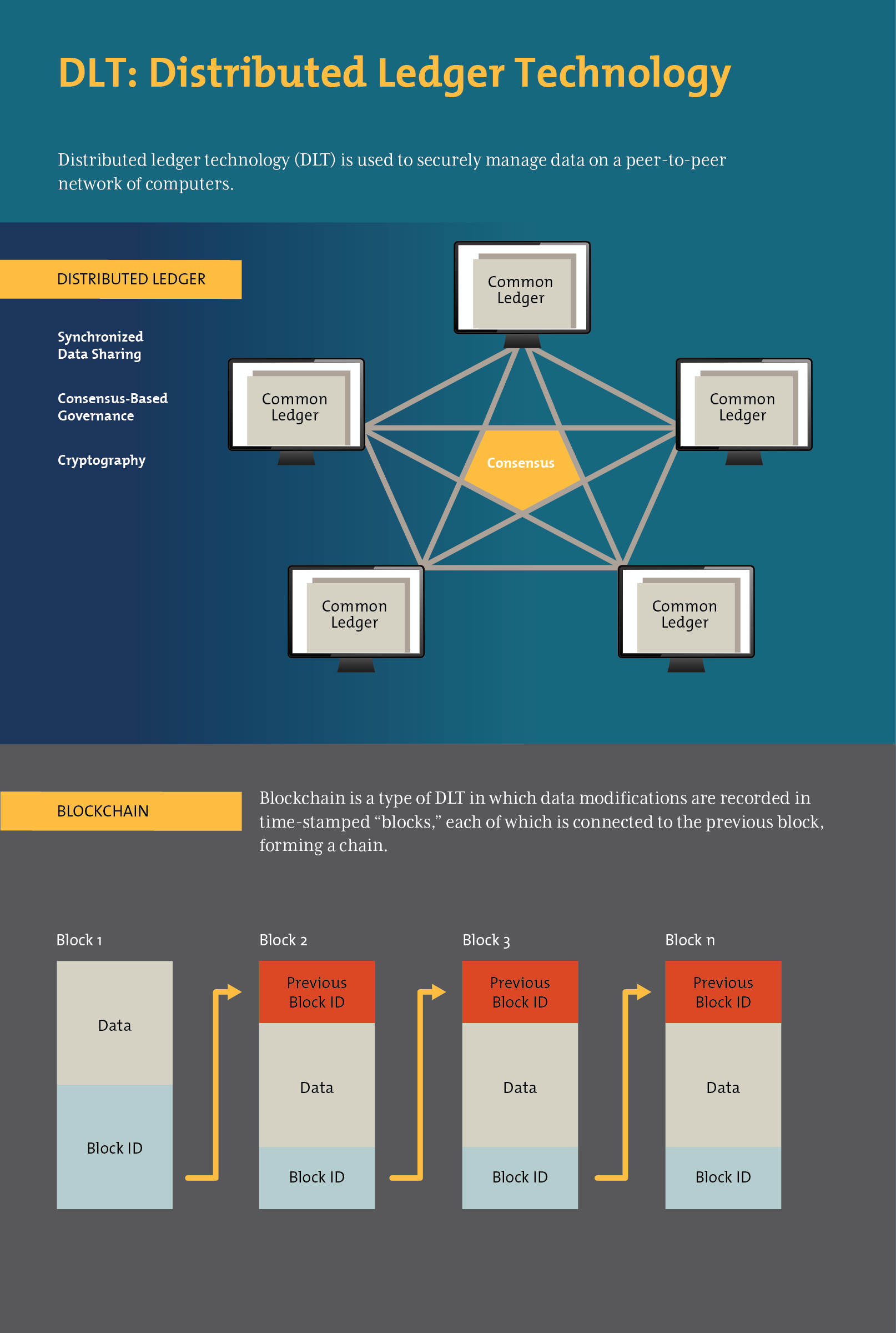 Distributed Ledger Technology (DLT)/Blockchain – a way of securely organizing data on a peer-to-peer network of computers. In a blockchain, which is a type of DLT, data modifications, such as transactions, are recorded in time-stamped blocks. Each block is connected to previous blocks, forming a chain. Modifications are confirmed and stored by all users on the network, which makes the ledger difficult to tamper with. Although blockchain technology is most commonly associated with virtual currencies, such as Bitcoin, the basic technology has a number of other potential use cases, including uses in regulatory compliance. In particular, DLT may be used for securely storing and sharing KYC information, as well as for cheaper and more secure international payments.