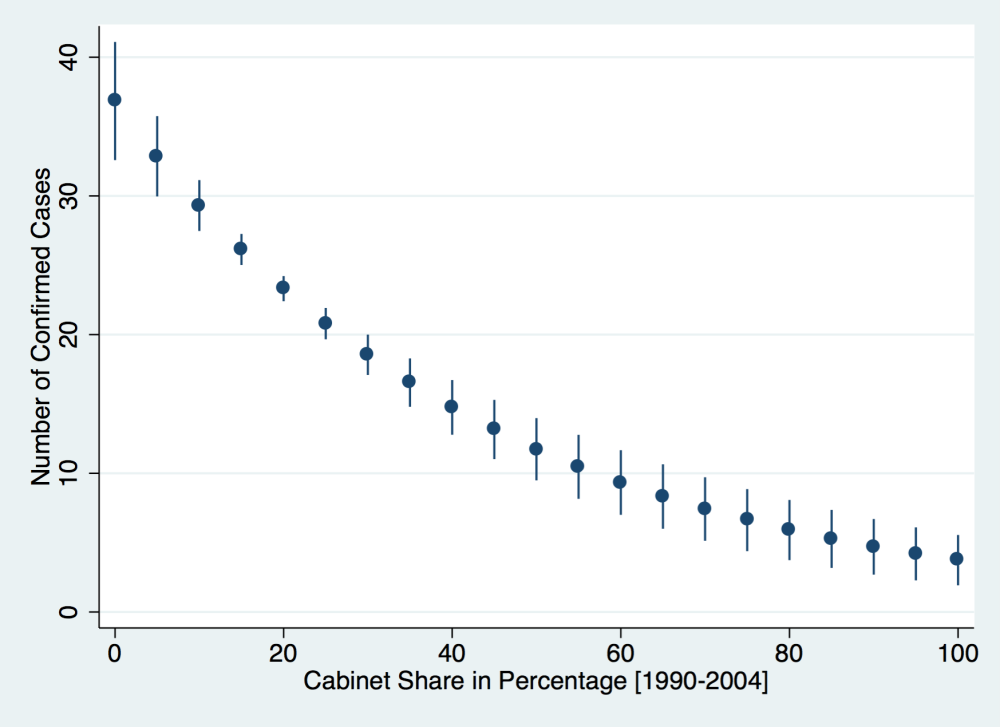Figure 1: Power Distribution and Ebola Cases (Estimated Coefficients). Estimated number of cases based on a Poisson QMLE is plotted against the share of ministerial positions held by the subdistrict’s dominant ethnic group in 1990-2004, after controlling for population density, the share of the dominant ethnicity, the number of health clinics, distance to main roads and Ebola treatment centers, and country fixed effects.
