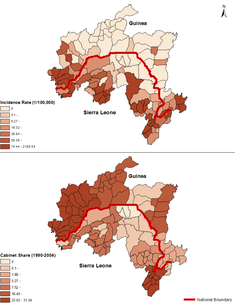 Figure 2: Power Distribution and Ebola Incidence Rates in Guinea and Sierra Leone. The maps here are based on the second level administrative units (District or Prefecture) along the border between Guinea and Sierra Leone. The main unit of analysis, however, was the third level administrative units (Chiefdom or Subprefecture) to capture more granularity. The map on the top shows the spatial distribution of the number of Ebola cases per 100,000 in each subdistrict. The map on the bottom shows the spatial distribution of ministerial positions held between 1990 and 2004 by the subdistrict’s dominant ethnic group. Data on Ebola come from Fang et al. 2016 and the WHO local office in Guinea. Data on cabinet positions held by ethnic groups come from Francois et al. 2015.