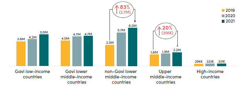 Further, former Gavi-eligible and never Gavi-eligible middle-income countries are already home to the highest concentration of un- and under-immunized populations (see Figure 3). And this trend is increasing.