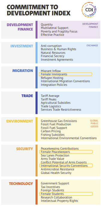 One major area of feedback in the review discussions was that we should assess policies that support gender equality in development. As the CDI approach is to look mainly beyond aid, we did not focus on how much ODA is allocated to gender-related projects, but instead on other policy areas. Our colleagues, Charles Kenny and Megan O’Donnell, have previously looked at how migration channels, trade policies, and defence efforts can more effectively promote gender equality, not just at home but also abroad.
