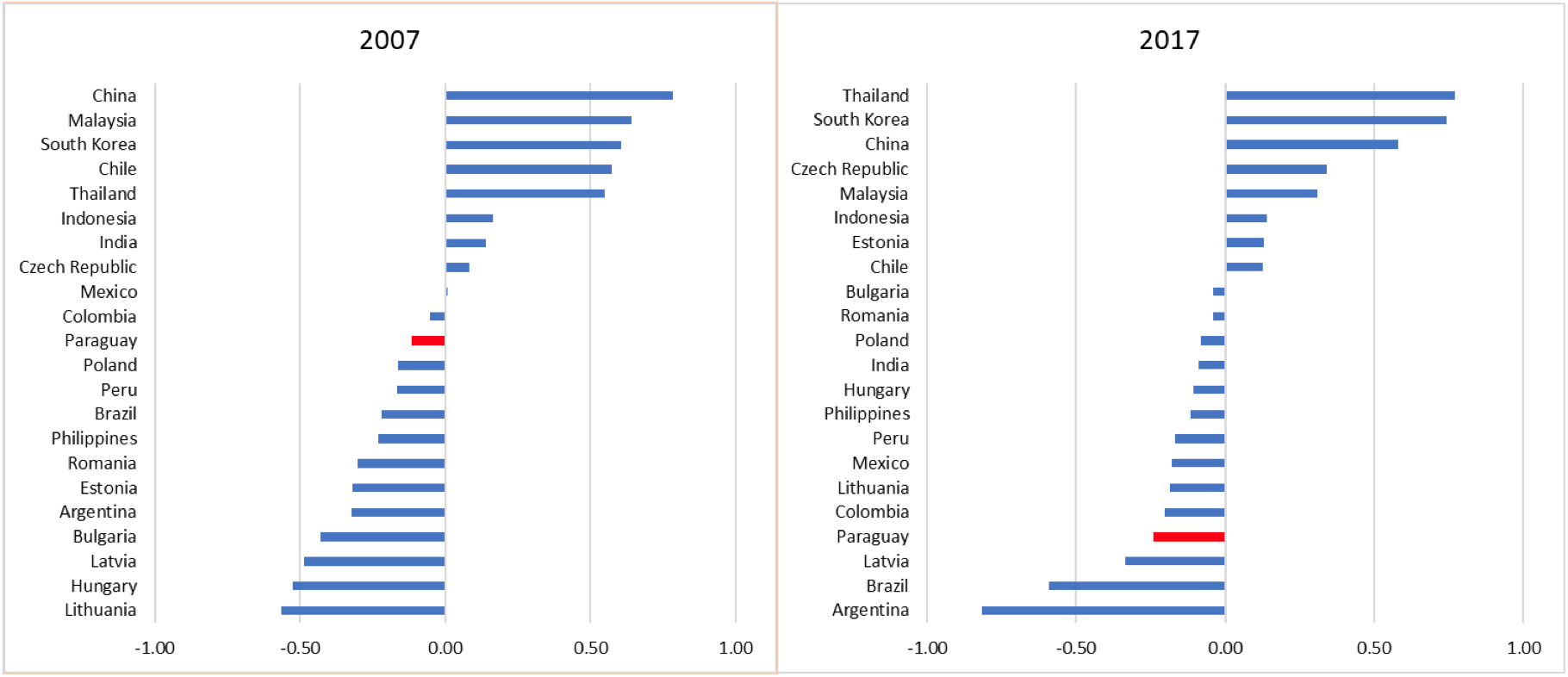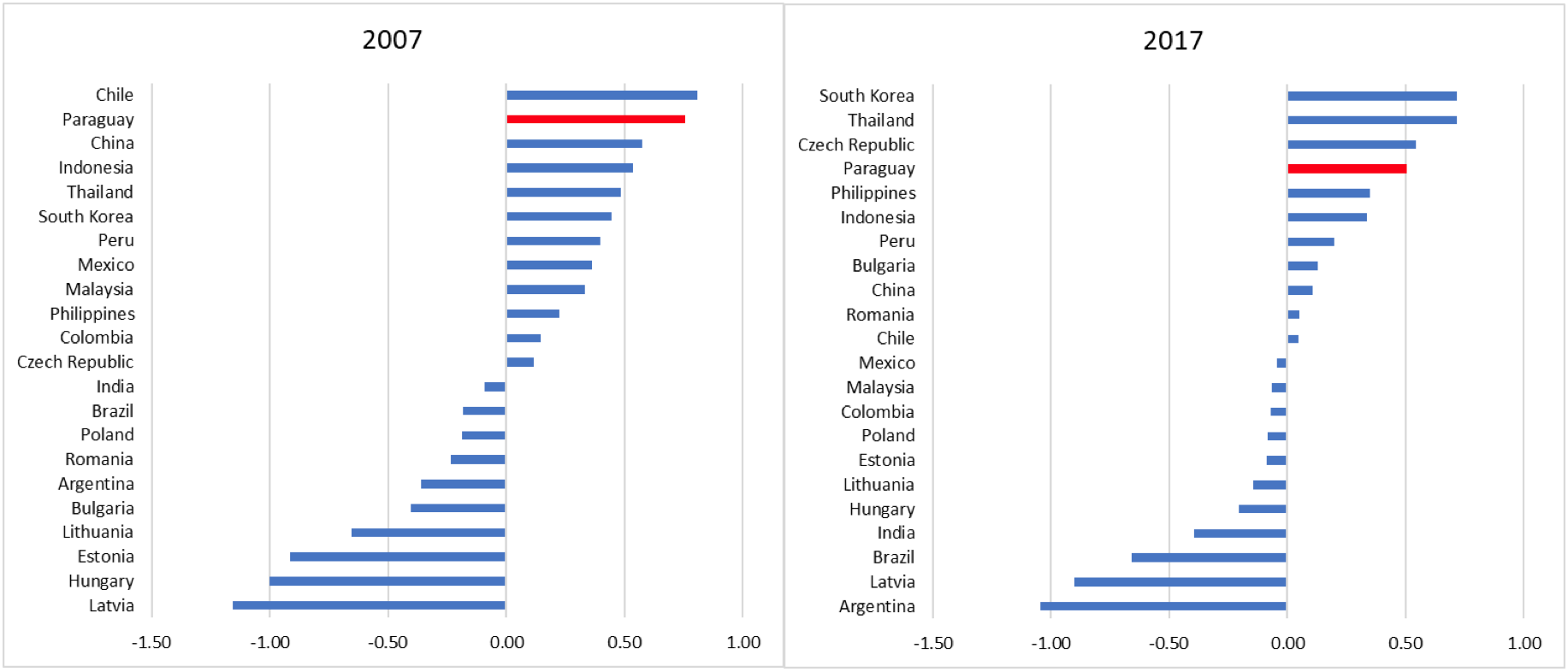 Paraguay only moves from second to fourth place in the ranking between 2007 and 2017, confirming the macroeconomic strengths discussed in this blog post. Yet, a second exercise that accounts for all variables considered in this blog post (macro and structural) paints a different picture.