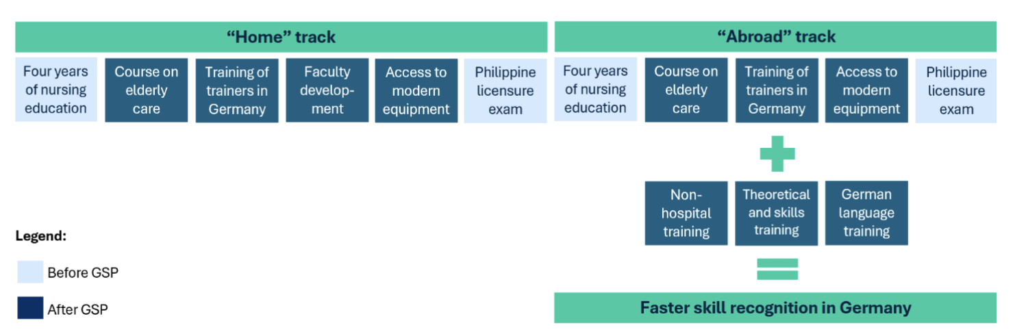 The figure below shows what was provided to trainee nurses on the “home” and “abroad” tracks. In the Philippines, a trainee nurse needs to undertake four years of formal studies and a professional licensure examination. In the third year, students could choose which track they went down. Those on the “abroad” track were provided with two and a half months of additional theoretical and skills training, as well as intensive German language training (up to level B2, which would enable them to work as a qualified nurse in Germany).