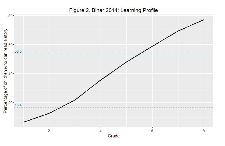 Figure 2 overlays the progress in Jehanabad (shown by the horizontal dotted lines) on the regular learning profile of Bihar created from ASER 2014 data for percentage of children who can read a Grade 2 level story.