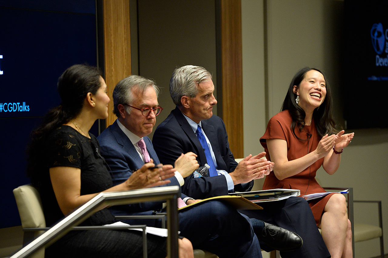 From left to right: Catherine Bertini, Fellow, The Rockefeller Foundation and former Executive Director of the UN World Food Program; Bathsheba Crocker, Vice President of Humanitarian Programs & Policy, CARE and former US Assistant Secretary of State for International Organization Affairs; Eric Schwartz, President, Refugees International and former US Assistant Secretary of State for Population, Refugees, and Migration; Jeremy Konyndyk, Senior Policy Fellow, CGD