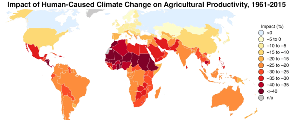 Studies reported in the paper suggest that that the current and future impact of climate change is likely to be larger in Africa than elsewhere, larger near the equator, and larger in particular for rainfed agriculture. One estimate suggests existing climate change may have already reduced agricultural total factor productivity by 40 percent or more compared to a no-climate-change scenario in these countries (see the figure below). That will be one reason why Niger’s cereal yields per acre are below where they were in the early 1960s. Looking forward, climate change might reduce Ethiopia’s agricultural output by one third compared to a no-climate-change scenario.