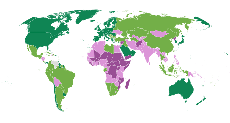 Agriculture-reliant countries near the equator are already home to most of the world’s poorest people. The figure below shows the global distribution of countries according to World Bank income classifications. The poorest countries, with an income below $1,135 per capita in Atlas GNI, are colored dark purple—you can see a band across the equatorial region of Africa.