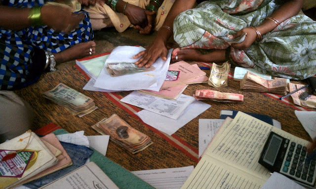My last stop in India was Mudimyal, a village about 12 kilometers (7 miles) from Yarvaguda as the crow flies. Mudimyal has 25 self-help groups, which are "federated" into a Village Organization, a body whose membership is the head of the SHGs. The Mudimyal VO is turn federated with other VOs in its mandal, and mandal organizations are in turn federated at the district level, and district organizations at the state level. By luck, we arrived during a meeting of the VO. It took place in a simple, sturdy concrete building. By the time I arrived, half the women had left. Interestingly this meeting was overseen by men, who work for the local mandal organization:(More pictures here. Zoom in on the photo icons near the lower right of the map.)SHGs mostly get their finance from commercial and state banks. However, a separate funding channel originates with the World Bank, flows through the government to SERP (see previous post), and down through the hierarchy just described. SERP, my guide said, makes grants to the mandal federations. These lend to village organizations at 6% interest. These in turn lend to SHGs at 12%, using the profit to cover administrative costs and fund other non-finance programs. The main purpose of the meeting I found was to handle the routine business of repayment and disbursement associated with this financial channel. So the cash in this picture is World Bank money:This meeting ran long because one SHG---actually one woman within that SHG---was having trouble keeping up with repayments, and so had requested a new loan from the VO. The women and the men discussed the matter quite vigorously---whether to make the loan, how much to lend. In the end, they agreed do it. Watching these women so energetically discuss this serious business, I appreciated two strengths of the SHGs. First, they give women ownership and power over important financial decisions. Granted the women in this meeting, as SHG heads, were probably strong characters to begin with. But it seemed like a healthy thing to empower them in this way:Second, I could see the flexibility of the SHG lending approach, born of its communal nature. The women decided to join together to help one of their own. That flexibility, as I wrote in my Yarvaguda dispatch, can be extremely valuable. As I write in chapter 7, it enhances freedom. MFIs apparently tend to be far more rigid.After the decision was made, I asked the women about their loans, as I had in Yarvaguda. To my surprise, while all had loans from their self-help groups, almost none of these dozen women had outstanding loans from the new MFIs, though a few had taken and repaid in the past and one had an outstanding loan from BASIX. (See the Yarvaguda post for more on these categories.) Yet Krishna, one of the men running the meeting, had done a census of Mudimyal and found 265 women borrowing from MFIs in a village of 420 households. Unsurprisingly, this collection of SHG leaders is unrepresentative. They were probably better off, and so perhaps needed credit less; they also may have had access to larger loans from their SHGs. No suicide stories here.I was more careful this time to ask about uses of their loans. Among the objects of investment: schooling, home improvement, a new house, irrigation pumps, dairy (water buffalo), autorickshaws (3-wheeled taxis), and a photo studio. As for household income, some reported earning 300--400 rupees ($6.66--8.88)/day, but more referred to the 70 rupees ($1.55)/day women could earn by working on other peoples' farms (perhaps an overestimate of the average income since the work is not available every day).Toward the end, I had a Lant Pritchett moment. The women asked if they could ask me questions. Of course. Do you have SHGs in the U.S.? Nope...well, the Grameen Bank is operating in a few cities. I explained that I do my financial business solo at banks.After group photos and a farewell, my guide and I left Mudimyal for the Hyderabad airport. 36 hours later I was home. It was something to jump from their neighborhood to mine like that. As I walked along the autumnal sidewalks of Capitol Hill toward my sweet home and family, I found myself imagining how my life would look through the eyes of the women of Yarvaguda and Mudimyal for whom a $500 or $1,000 loan is an intense strain.