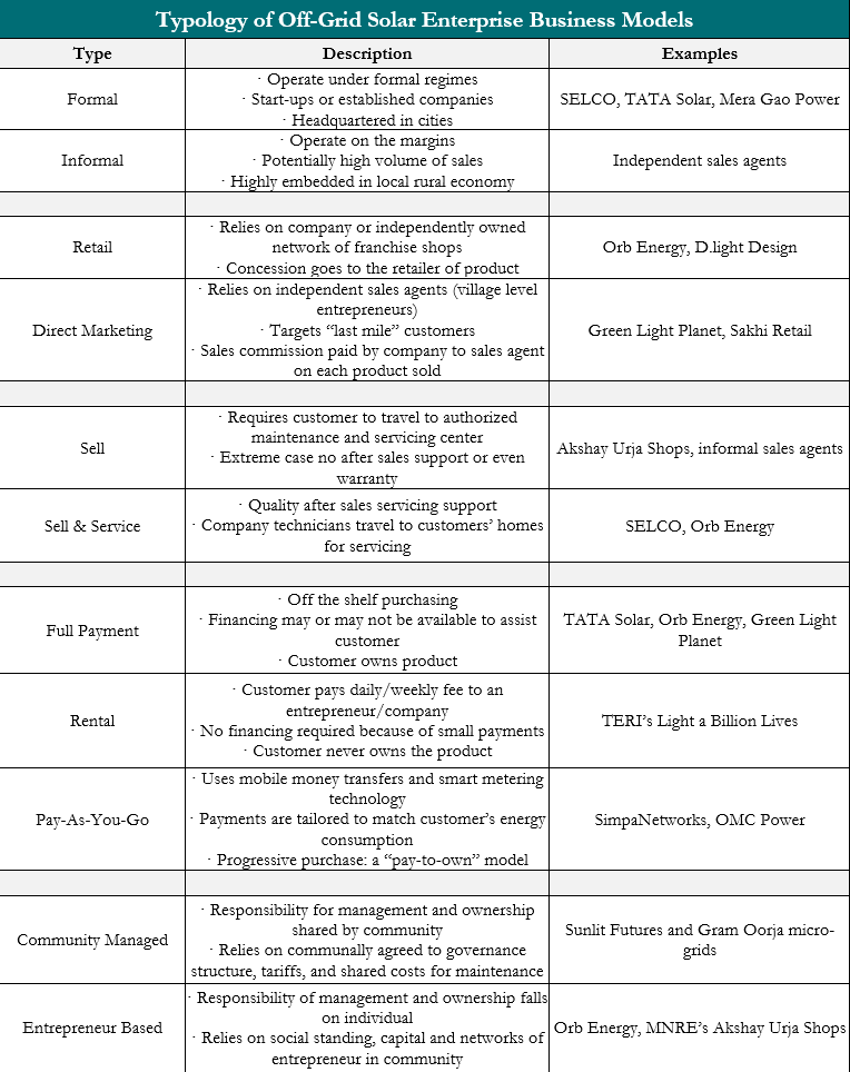 India is a country of 1.2 billion people, with over 400 million who lack access to reliable electricity. Government plans to provide power for all by 2019 include using distributed (off-grid) energy sources such as solar home lighting systems, solar lanterns and solar powered micro-grids. Buoyed by the UN’s Sustainable Energy for All (SE4ALL) target to provide universal electricity access by 2030, entrepreneurs with novel business ideas have burst on to the scene. These entrepreneurs are taking advantage of both public and private capital to set up enterprises with a variety of innovations to capture this large market of consumers. In order to differentiate these enterprises from one another, we must create a typology based on their business models (see table below).
