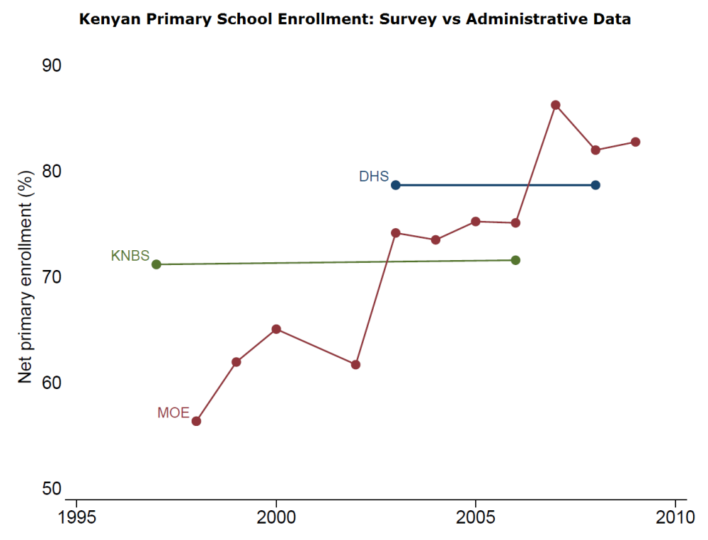 Amanda Glassman and I have a working paper forthcoming on this question, looking at these discrepancies between administrative and survey data in education and health across Africa. Here's a spoiler: when the Ministry of Education abolished primary school fees, it radically changed the incentives for truthful reporting by head teachers. There are some safeguards in place to try to avoid outright lying, but at the end of the day, schools get allocated more teachers and more funding if they report more pupils. So schools have an incentive to exaggerate their numbers. Parents, in contrast, don't. Incentives, incentives, incentives. The same point applies, Amanda and I hope to show, when you ask agricultural extension workers to report how much maize was grown in their village, or nurses how many patients they saw. Incentives to misreport plague administrative data systems.
