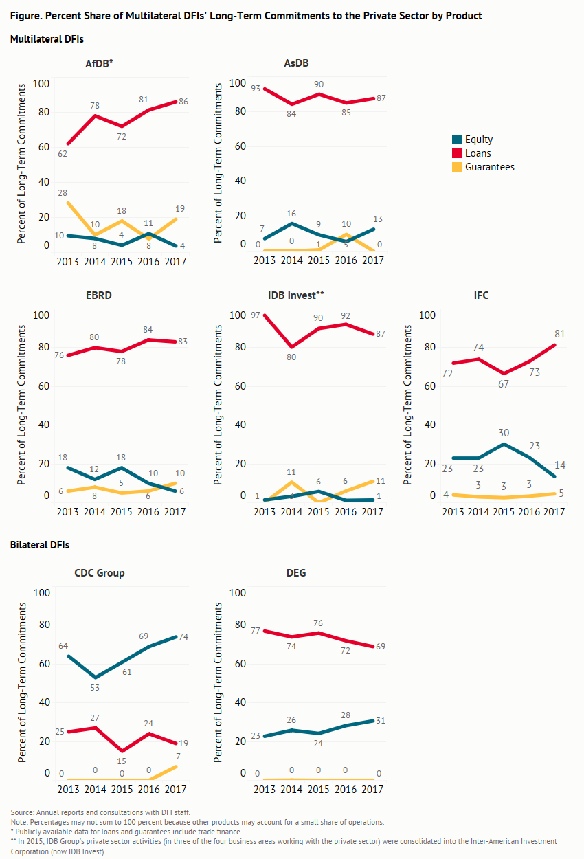 In this context, we thought it might be helpful to look at recent trends in the product mix of multilateral DFIs to see if the mix is changing and/or significantly different across institutions. The figure shows the share of annual commitments by product for the private finance operations of five major multilateral development banks (MDBs) and, for purposes of comparison, for two bilateral DFIs with quite different product mixes.