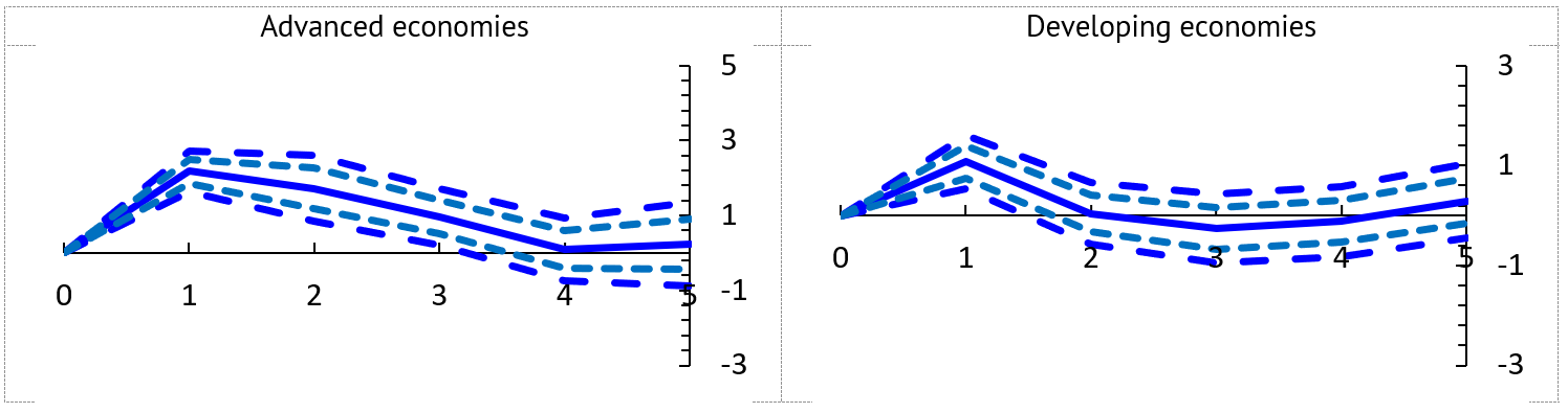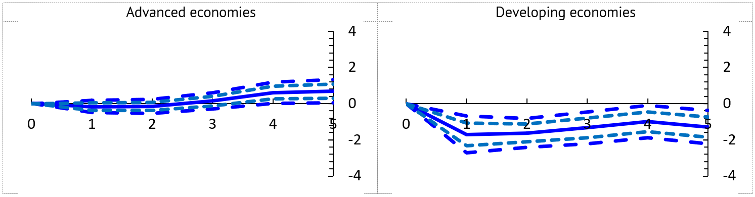 Note: Impulse response functions are estimated using a sample of 170 countries over the period 1980-2017. The graph shows the response and both the 90 and 68 percent confidence bands. The x-axis shows years (k) after pandemic events; t = 0 is the year of the pandemic event. Estimates based on equation 1. Standard errors in parentheses are clustered at the country level.