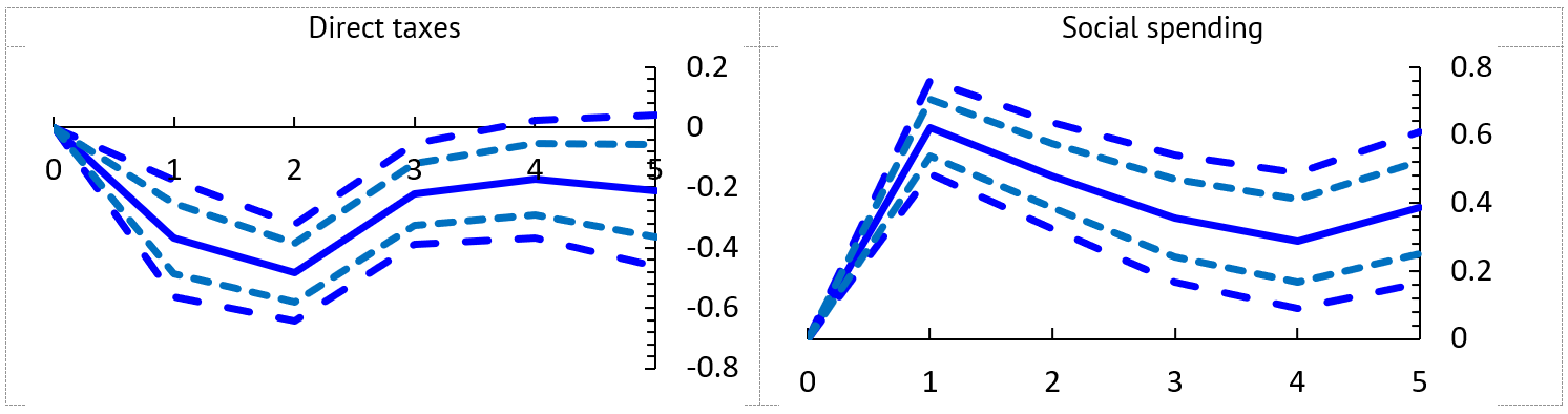 A relevant question is whether the effect on the budget is being driven by a particular component of revenues and expenditure. To answer this, we separate revenues into direct taxes (e.g., income and corporate taxes), indirect taxes (e.g., the value-added tax), and non-tax revenues (e.g., external grants). We separate expenditures into public consumption, public investment, and social spending. We find that the fall in revenue is mostly driven by a drop in direct taxes followed by a decline in non-tax revenues. Expenditure increase, in turn, is mostly the result of the operation of automatic stabilizers arising from higher spending on social programs (Figure 3).Note: See previous note.