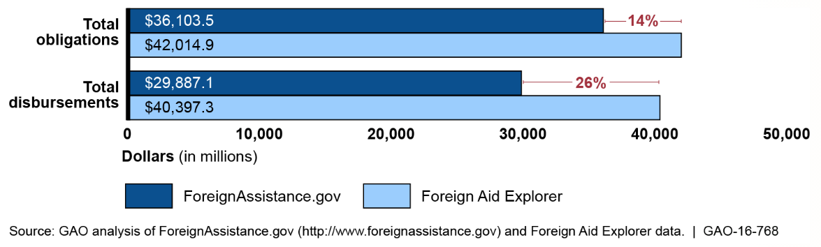 In coming up with its findings, GAO compared the data posted on the State Department-managed ForeignAssistance.gov with that available on a different foreign assistance data clearinghouse, the USAID-managed Foreign Aid Explorer. Foreign Aid Explorer reports annual data aggregable at the sector, country, or account level (among other options). Because the data on Foreign Aid Explorer go through a lengthy vetting and verification process, they are reported with over a year lag, making them of limited use for important things like coordinating spending in-country with host country governments and other donors. ForeignAssistance.gov attempts to remedy this and other transparency gaps by collecting and reporting data down to the transaction-level on a quarterly basis with information posted in a more timely fashion (i.e., within the current fiscal year). Because both sites use a similar definition of foreign assistance, however, aggregate comparisons are possible. In making these comparisons, GAO found that ForeignAssistance.gov is missing a substantial portion of the verified data on Foreign Aid Explorer, suggesting a persistent lack of transparency when it comes to the more useful, detailed, and up-to-date data.