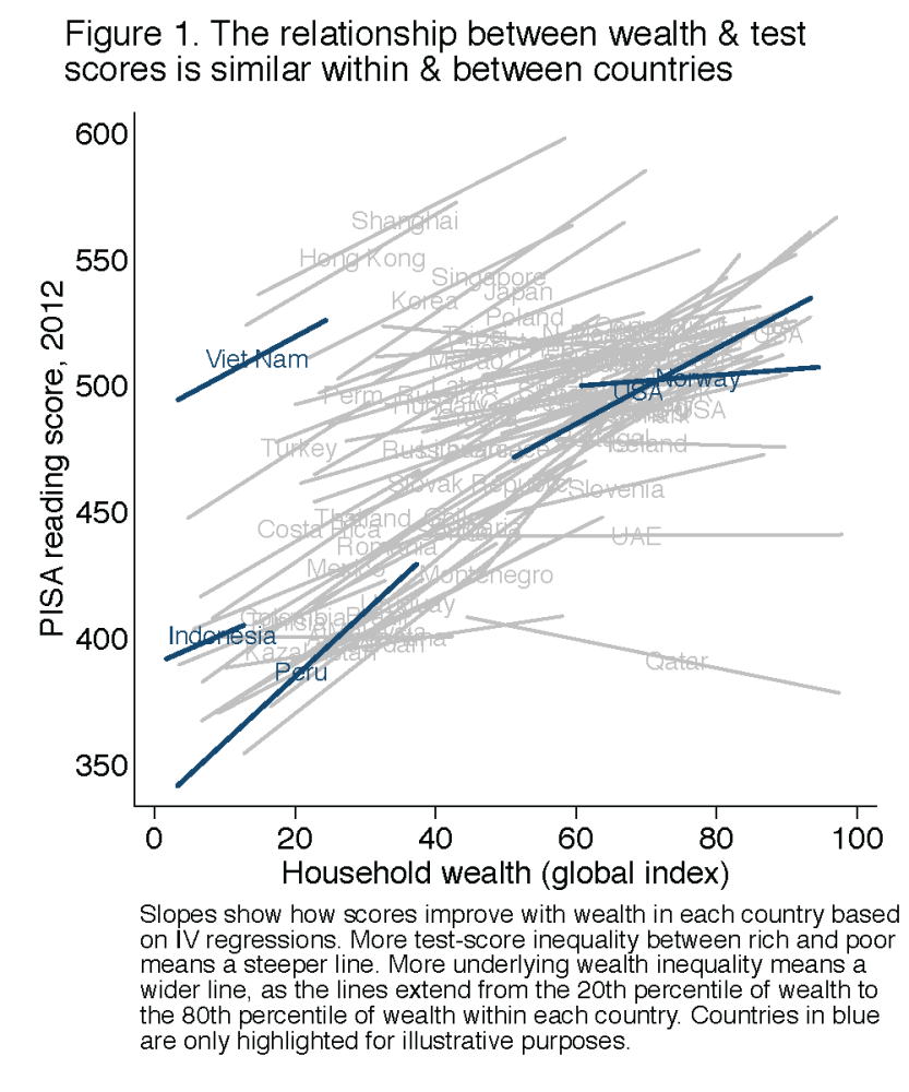 So does that mean poor countries such as Indonesia, Peru, or Vietnam should be looking to rich countries like Norway and the United States for education policy advice? The answer depends, in part, on how much of the test-score gap between rich and poor countries you think reflects superior school systems in rich countries and how much is due to the simple fact that American and Norwegian kids are a lot richer and have innumerable advantages both in and out of school due to that wealth.