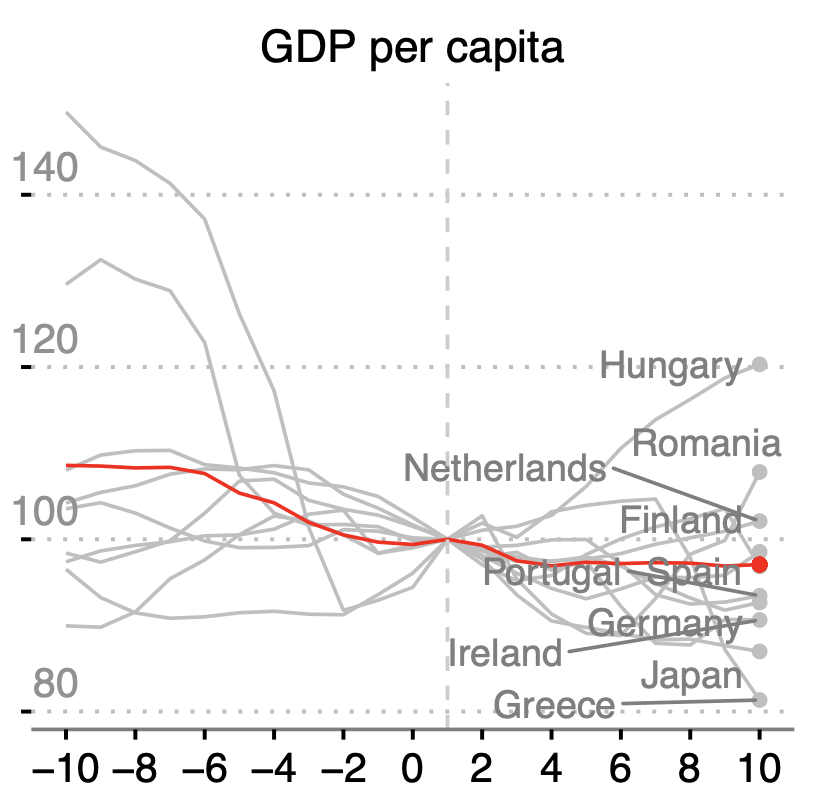 The figure below looks at GDP per capita for countries that enter negative prime-age population growth (where the absolute number of working age people is declining) as a proportion of the average of all other countries in their income group, lined up so that year ‘0’ is when negative prime-age population growth begins and scaled to 100 in that year. The direction red line represents GDP per capita performance relative to income group comparators over time for countries that cross into negative prime age population growth at year zero. That transition is associated with falling behind peers in terms of per capita GDP growth. High-income countries experiencing positive prime-age population growth have seen an average 2.8 percent annual GDP growth of late. That compares to 1.5 percent for those seeing negative population growth.