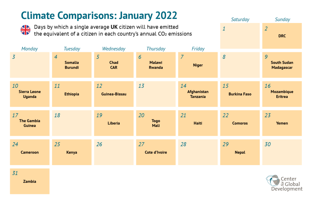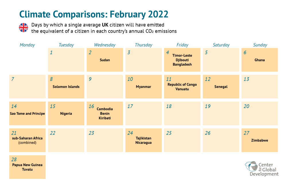 There is vast inequality in energy use, and CO2 emissions, between richer and poorer countries. Just a few days of life in the UK produces more emissions than people in many low-income countries produce in the entire year. The CO2 emissions of the average UK citizen are estimated to be roughly 40 times that of the average Ugandan. If these emissions are spread evenly throughout the year, this means that by 10th January the average Brit had already emitted more CO2 than the average Ugandan will over the whole year. Here's the full picture for January and February 2022.