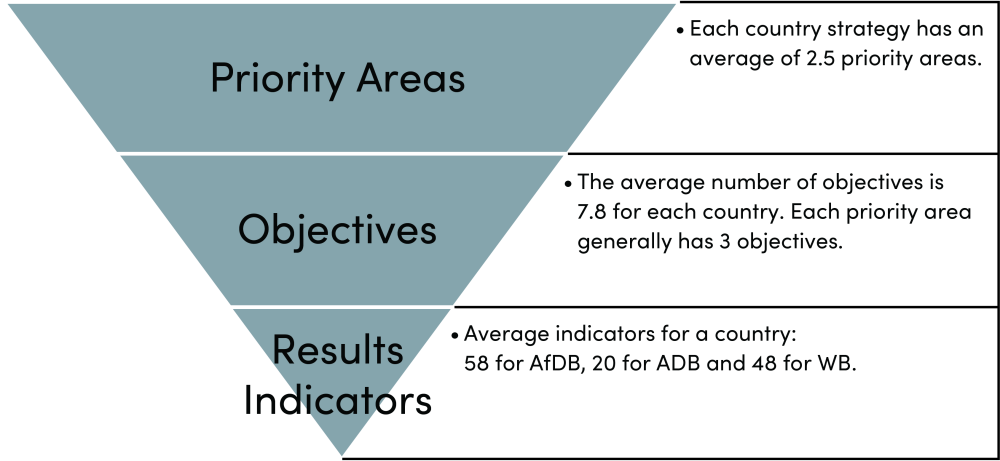 Although terminologies differ, the MDBs in our sample use the same general three-tier hierarchy in the structure of their country strategies. What we term priority areas are broad country-level goals pursued in a strategy. An example is “inclusive growth”. To make progress on these priority areas, the MDBs identify objectives that define sectors and reforms where investments and other interventions are needed. An example is an “improved business regulatory environment and access to finance.” Results indicators are used to quantify the outputs and outcomes of MDB interventions targeting these objectives. They are the most concrete elements of the country strategy activities. An example might be setting a target for the number of days it takes to register and obtain a business license.