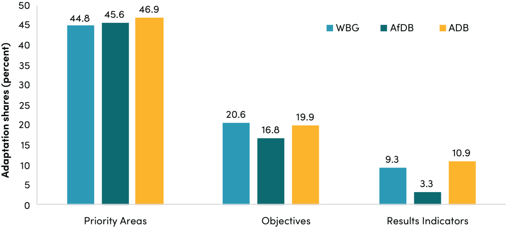 Interestingly, the adaptation shares are similar across the three institutions for the three different strategy levels: adaptation accounts for more than 40 percent of priorities; it drops to about 20 percent of objectives, and 10 percent or less of results indicators. This suggests similarities in vulnerable countries’ engagement with different MDBs and similar MDB approaches in vulnerable countries.