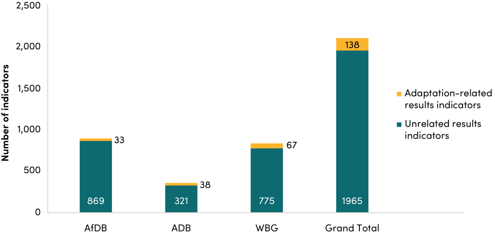 It is hard to know what accounts for this pattern of low adaptation indicators shares. We know that it is difficult to measure adaptation outputs and outcomes effectively and in a standardized way, both conceptually and in practice – a problem that affects all three MDBs. The development of standardized metrics to measure adaptation results has lagged the focus on adaptation objectives.