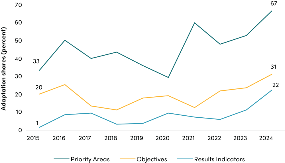As climate change costs and risks multiply, we would expect the focus on adaptation to rise. Trends over time in the shares of adaptation in priorities, objectives, and results indicators are shown in Figure 5.