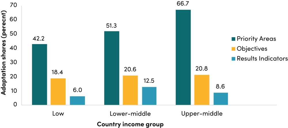 Figure 6 compares adaptation shares across country income groups to examine whether country strategies for poorer countries focus more or less on adaptation. The data show broadly the same pattern in low-income countries (LICs), lower-middle-income countries (LMICs), and upper-middle-income countries (UMICs). LICs have the lowest shares at all three strategy levels—not a surprising finding given the array of challenges confronting the poorest countries. Interestingly, UMICs have the highest share of adaptation priorities, indicating that UMICs, contrary to what is sometimes assumed, are focused on adaptation as well as mitigation.