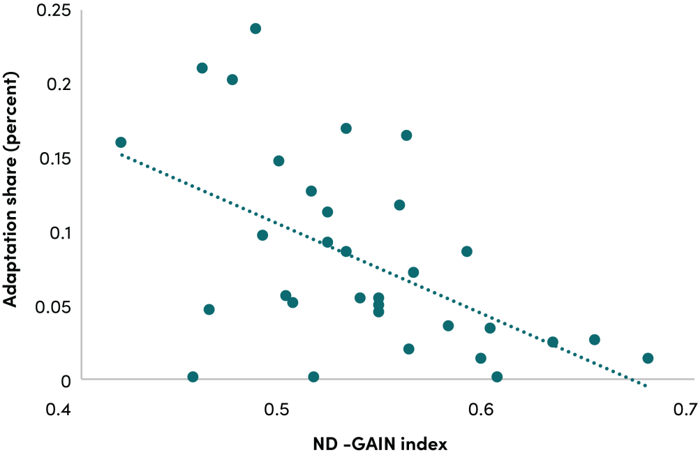 Figure 7. The relationship between country ND-GAIN index scores and shares of adaptation-related results indicators across MDBs