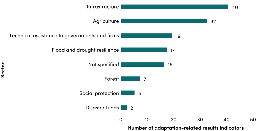Over half of the indicators used to assess MDB adaptation interventions are concentrated in infrastructure and agriculture. Examples of adaptation results indicators in these sectors are kilometers of resilient roads built and land area covered by sustainable agriculture practices. The next most important category is technical assistance to governments and firms, followed by flood and drought resistance.