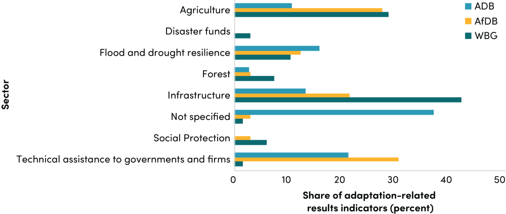 Figure 9 does show some differences. WBG concentrates most on measuring the results of adaptation activities in infrastructure and agriculture. The regional banks have a larger share of results indicators than the WBG in technical assistance to governments and firms. Non-specific language in ADB results metrics makes many hard to classify by sector.
