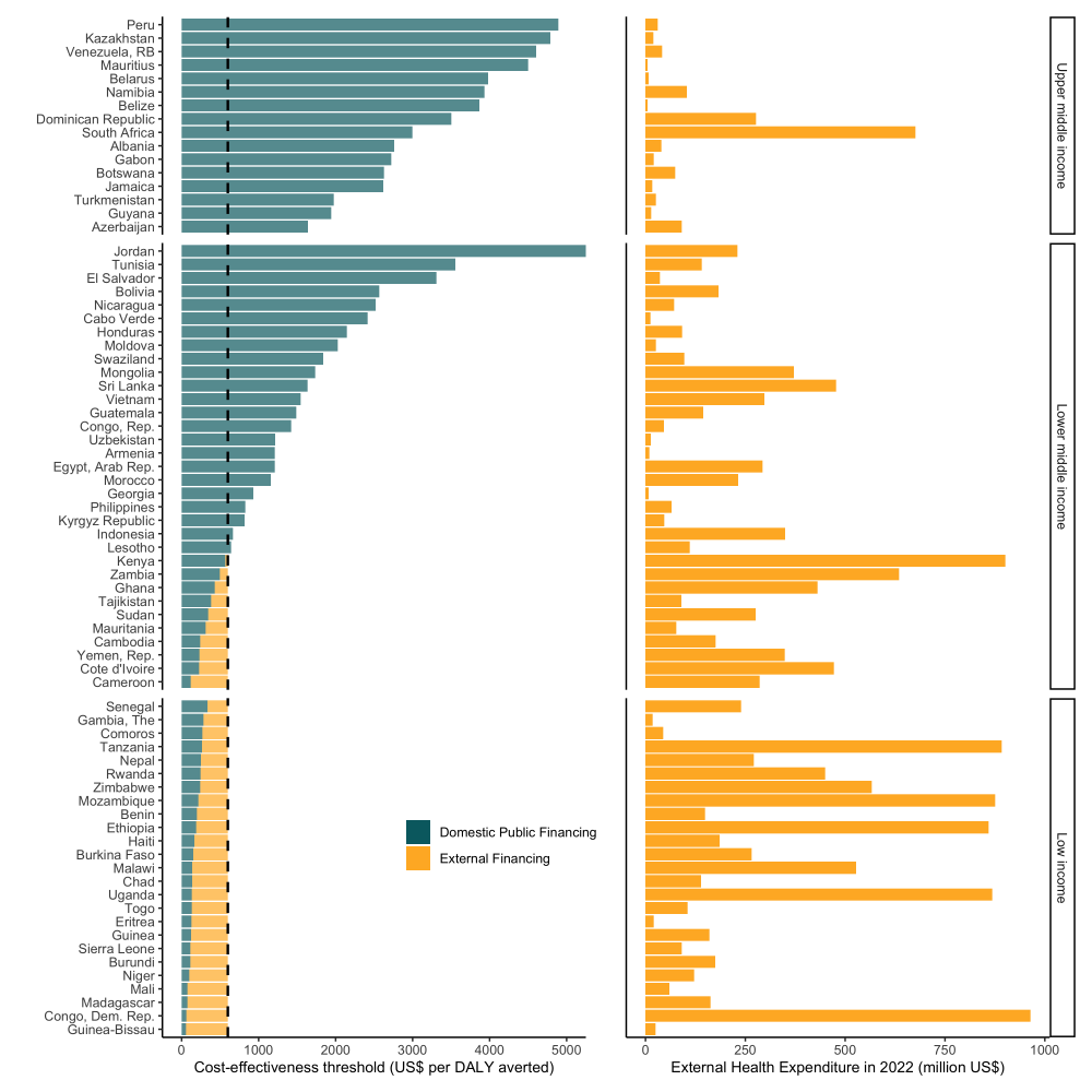* Panel A: Each bar is a country health services package, the length is the cost-effectiveness of the least cost-effective service funded. Panel B: Each bar is the total health expenditure from external sources in 2022 according to the WHO Global Health Expenditure Database.