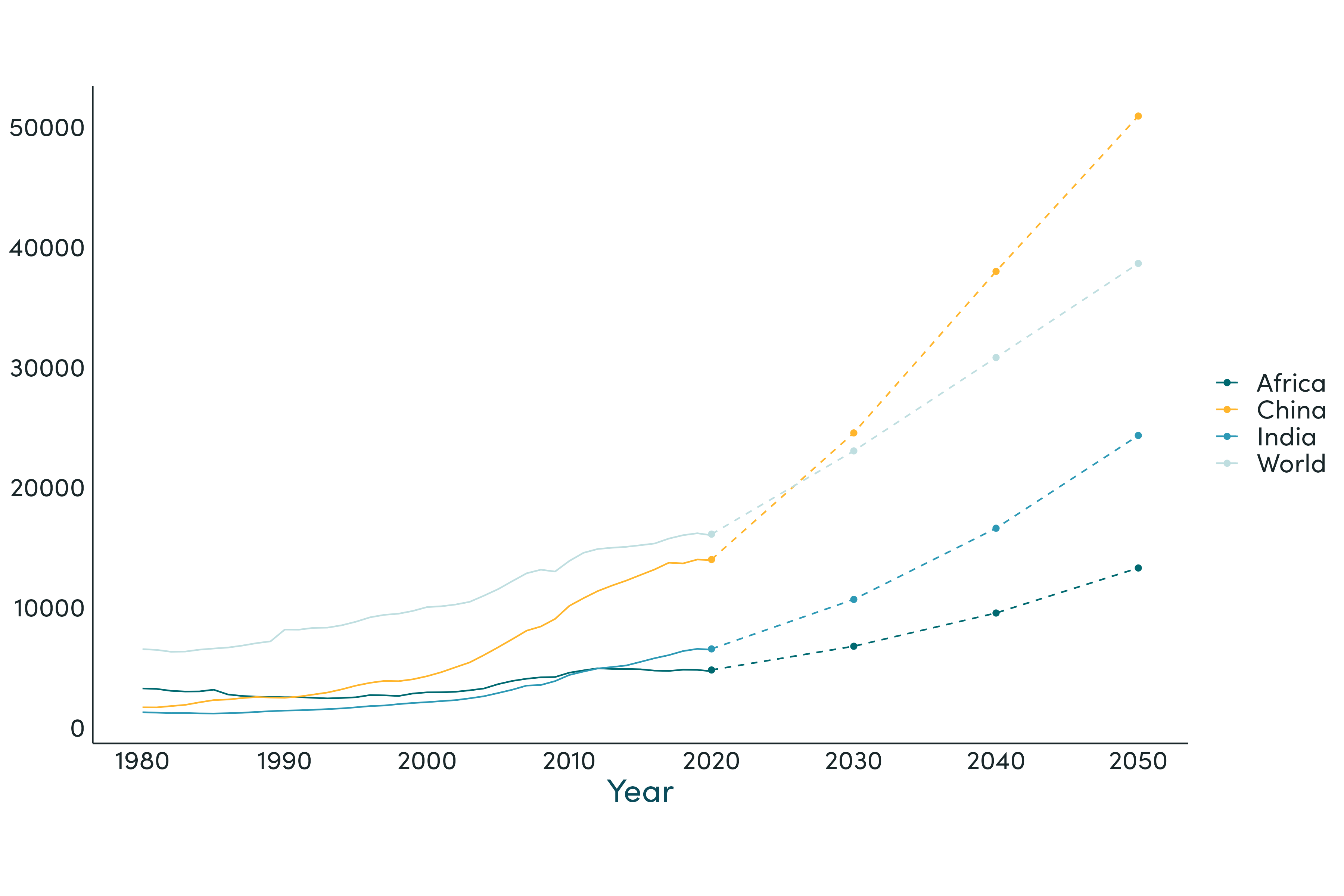 Global GDP per capita considerably more than doubled in the thirty year period 2020-50, a slightly faster rate of growth thanmanaged over the previous thirty years. China's average income in 2050, at $50,000 easily surpassed the level of the EU from thirty years prior (by 2050, the EU's average income had reached close to $100,000). Africa's average income per headclimbed from $4,800 to $13,300. By 2050, there were no countries left that met the definition of 'low income' and 85 percent of the world lived in upper middle or high income countries, up from around fifty percent in 2019. The global map of countries by income category changed markedly, not least nearly all of the Americas as well as Eurasia North of the Himalayas reachedhigh income status.