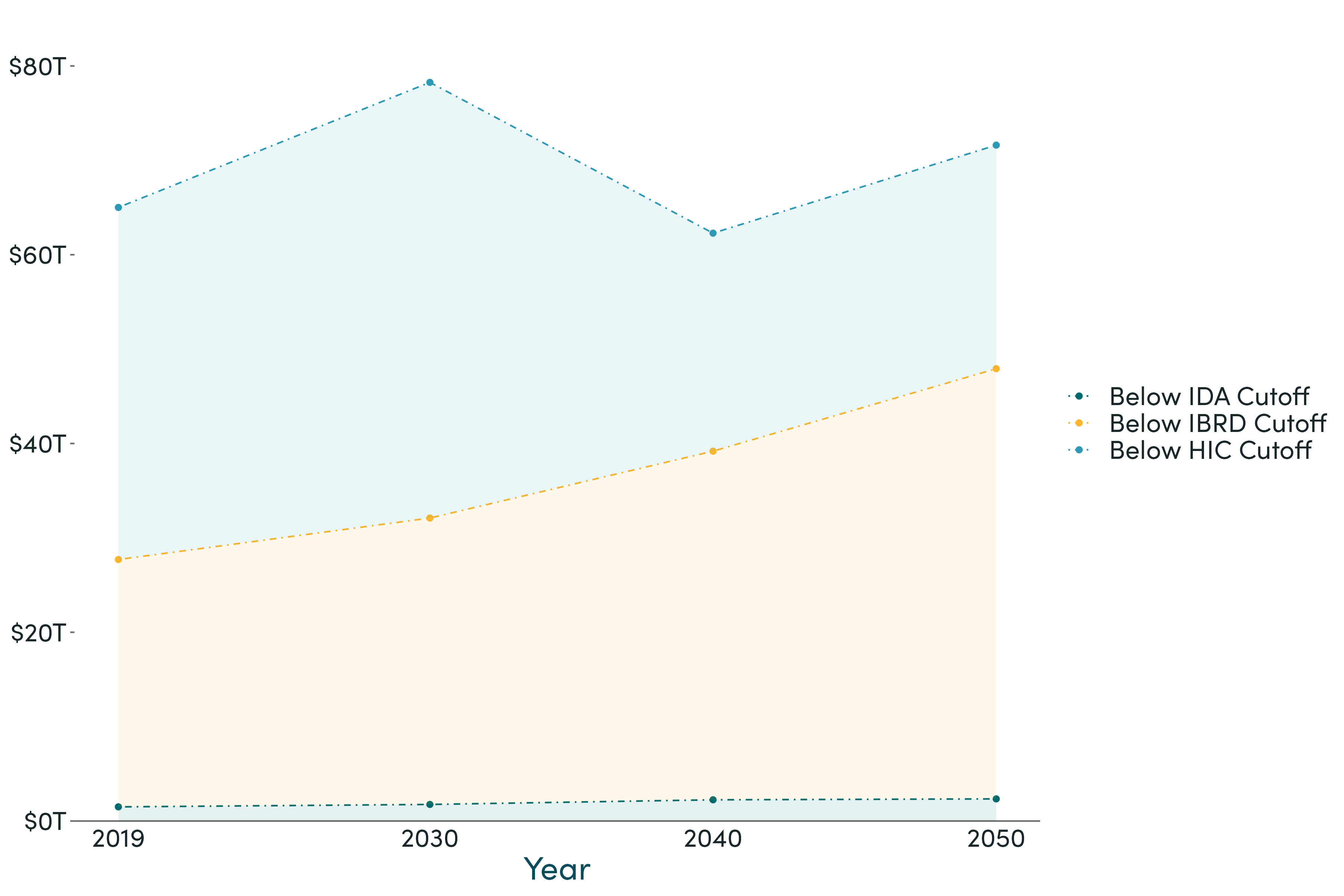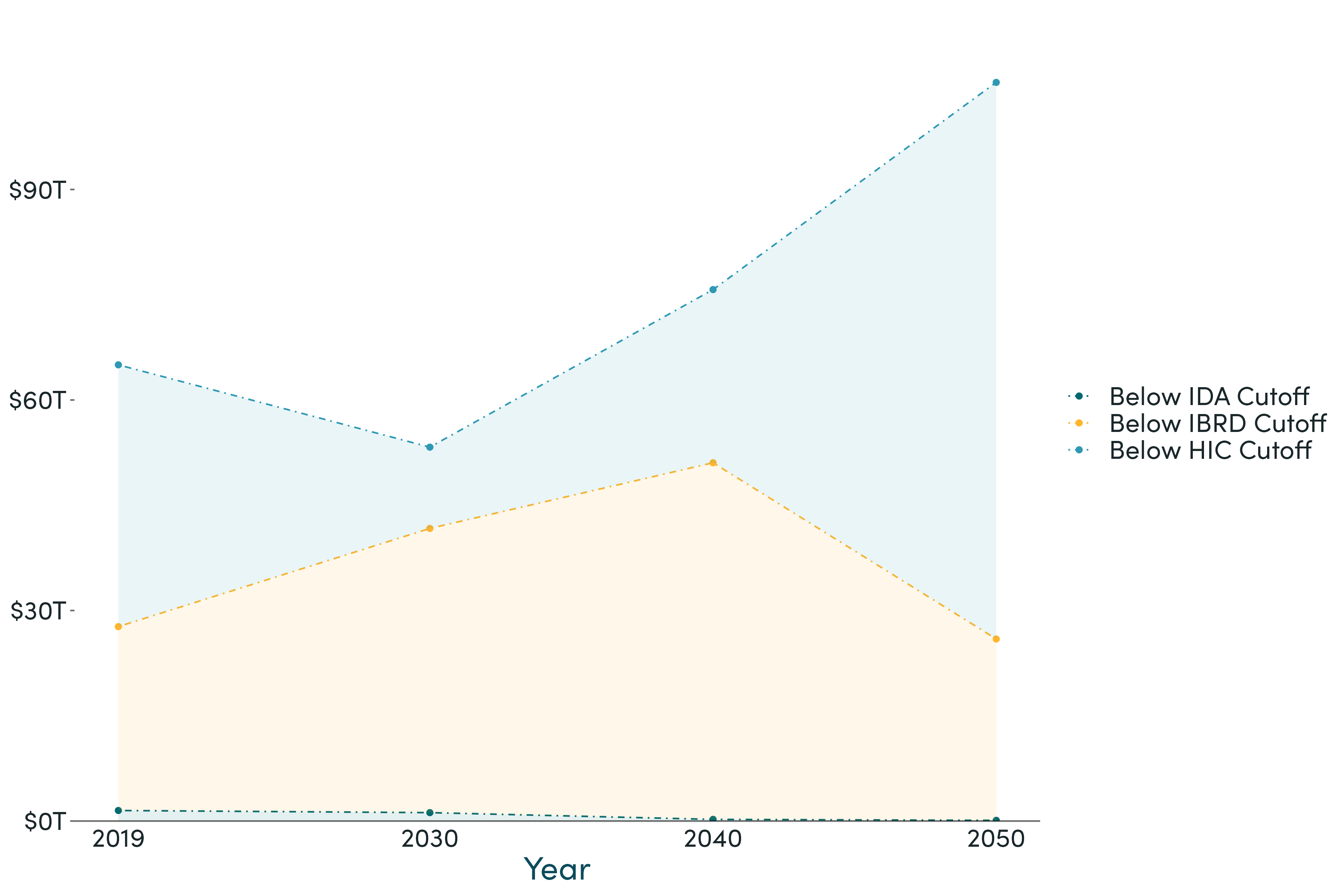 Strong growth in most IDA countries saw the total size of eligible economies under the IDA cutoff fall from $1.5 trillion in 2019to $1.2 trillion in 2030 and below $100 billion in 2050. Alongside allowing considerably more generous support to the poorest countries including in the Sahel, this allowed for a combination of raising the IDA threshold and diverting some resources to thesubsidy of global public goods and payments to end poverty. (The IBRD borrower pool grew in the short term, but as countriesgraduated it, too, began to shrink by 2050).
