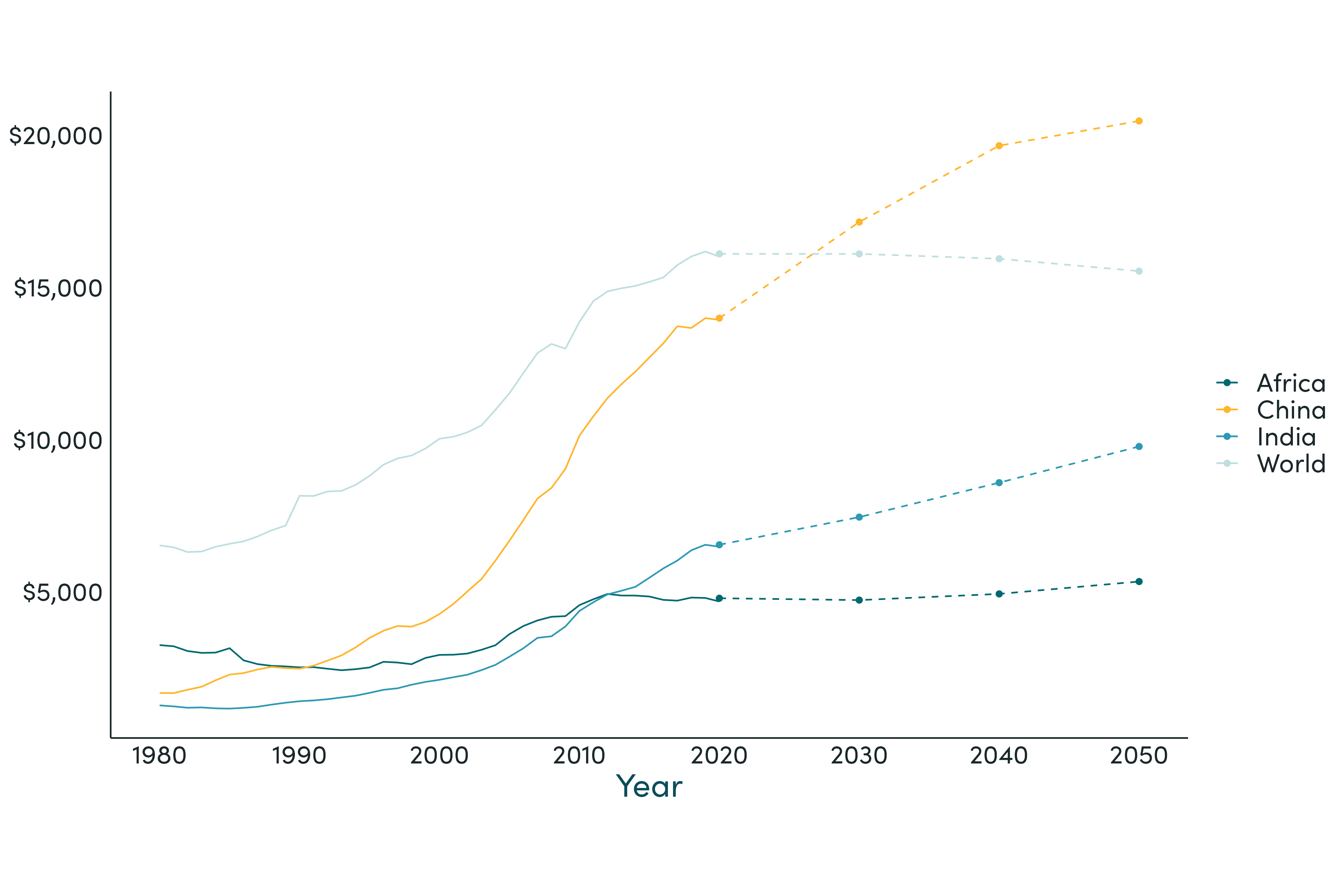 Figure 10. World, Africa, China and India GDP per capita (2017 USD)